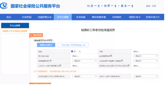 人社部于2019年底通過國(guó)家社會(huì)保險(xiǎn)公共服務(wù)平臺(tái)開通了養(yǎng)老金測(cè)算服務(wù),目前支持的是城鎮(zhèn)企業(yè)職工、個(gè)體工商戶或靈活就業(yè)人員的養(yǎng)老金測(cè)算。